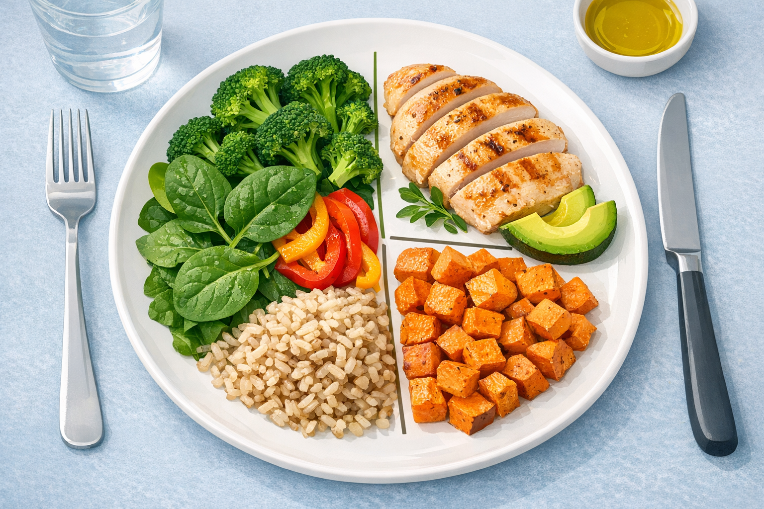 Build balanced meals. Each meal should include protein, healthy fats, and fiber-rich carbohydrates. This combination slows digestion and prevents sharp blood sugar spikes. A balanced plate might include grilled salmon (protein), roasted vegetables (fiber), quinoa (complex carbs), and a drizzle of olive oil (healthy fat).